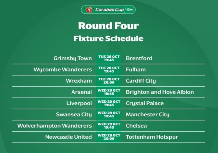 联赛杯第4轮:阿森纳vs布莱顿、利物浦vs水晶宫10月30日3:45进行